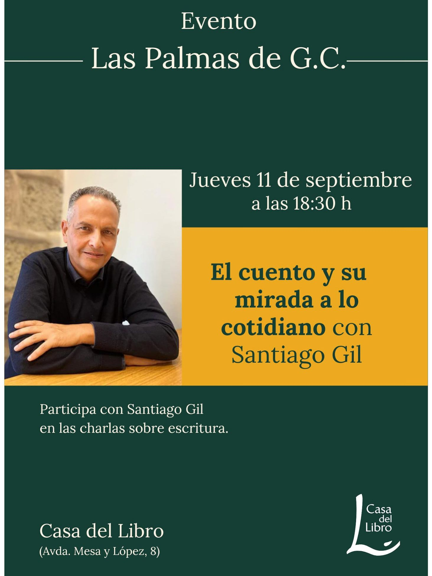 Santiago Gil compagina su labor literaria con la docencia, impartiendo talleres de escritura creativa en distintos espacios culturales y educativos. A lo largo de los años ha acompañado a decenas de alumnos en el descubrimiento de su propia voz narrativa, explorando técnicas de narración, poesía y microrrelato.